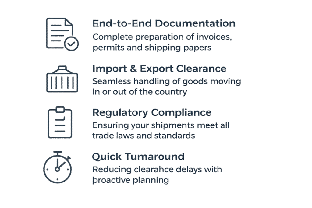 Our experienced team manages every step of the clearance process, from preparing accurate invoices, permits, and shipping papers to coordinating directly with customs authorities. We handle both import and export clearance, ensuring your goods comply with all trade laws and regulations. With our expertise, you can avoid costly errors, unnecessary delays, and unexpected fines.
